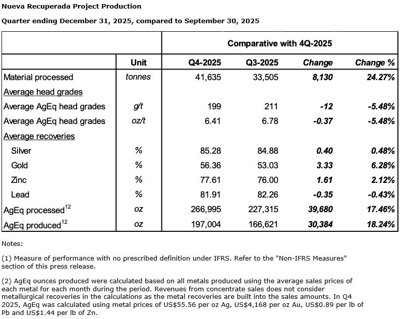 Silver X Mining Corp. has released its operating results for the fourth quarter ended Dec. 31, 2025, at the company's Nueva Recuperada property in Peru.