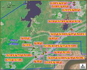 - surface samples: Gold up to 11.4 g/t, Silver up to 1,050 g/t, Copper up to 10.55%, Lead up to 18.85%.