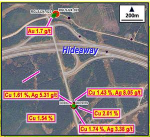 Figure 4 - Hideaway Prospect (Inset 2) - Sample Grades (Source of Map: Riversgold press release on ASX April 9, 2025)