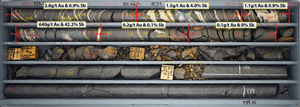 Figure 7. Photo of drill core from BC463 (520 Vein) showing the sheeted nature of the ore veins. Note the oxidised interval adjacent to the intercept signifies an historical stope adjacent to the in situ high-grade veins. Composited interval graded 143.7g/t gold and 10.8% antimony over 1.35m (ETW 1.06m).