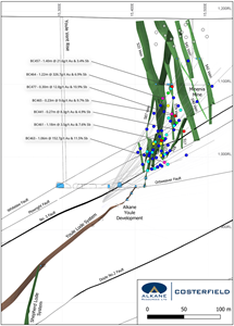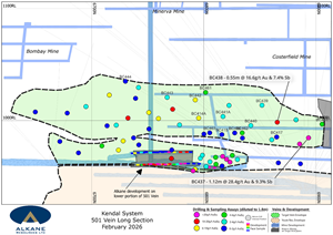 Long Section of the Kendal 501 Vein with high grade assays highlighted. The lower portion of the 501 vein has already been accessed by Alkane, and diluted face grades are shown alongside drilling intercepts.