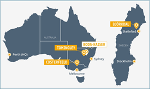 Alkane’s wholly owned producing assets are the Tomingley open pit and underground gold mine southwest of Dubbo in Central West New South Wales, the Costerfield gold and antimony underground mining operation northeast of Heathcote in Central Victoria, and the Björkdal underground gold mine northwest of Skellefteå in Sweden (approximately 750 km north of Stockholm). Ongoing near-mine regional exploration continues to grow resources at all three operations.
