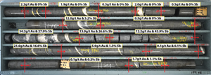 Drill core photos from BC418 (590 Vein) showing the nature of veining with individual assay grades of the samples. Composited interval graded 13.6g/t gold and 16.4% antimony over 2.22m (ETW 1.37m).