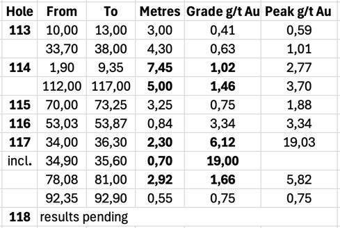 • Hole CJO 114, drilled outside the current resource, returned 7.5m @ 1.02g/t gold from 1.9m depth and 5m @ 1.46g/t gold from 112m depth, confirming that mineralization extends beyond the existing resource boundaries.