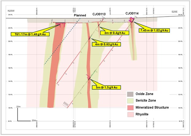 Drillholes CJO 113 and 114 partially tested a broad zone of alteration related to the SW extension of the Baldo "A" structure (Figure 4). This alteration zone contains a zone of 17m @ 1.46g/t gold in trenching which is interpreted as not having been intersected by CJO113 and which will be further drill tested as indicated in Figure 5. Where drilled further north, the Baldo "A" structure dips to the east, whereas the trenched interval is currently interpreted to be sub- vertical.
