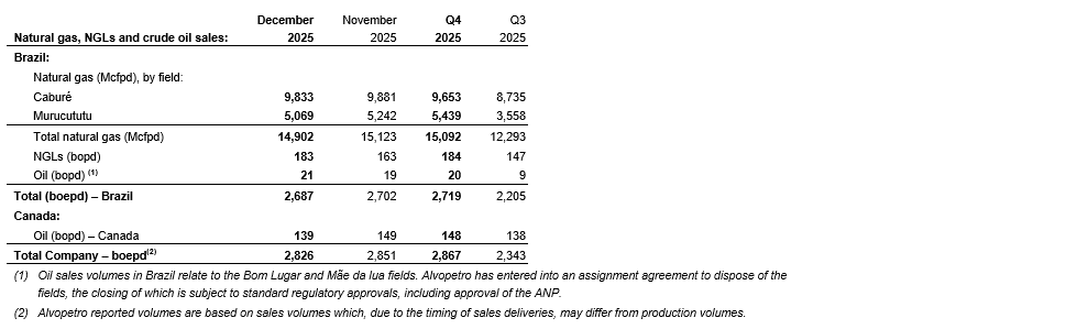 Alvopetro Energy Ltd. had December sales volumes of 2,826 barrels of oil equivalent per day (boepd) (based on field estimates). In Brazil, December sales averaged 2,687 boepd, including natural gas sales of 14.9 million cubic feet per day (mmcfpd), associated natural gas liquids sales from condensate of 183 barrels of oil per day (bopd) and oil sales of 21 bopd. In Canada, December sales averaged 139 bopd. This brings the company's Q4 (fourth quarter) 2025 sales volumes to 2,867 boepd, an increase of 22 per cent over Q3 (third quarter) 2025 and a new quarterly record for Alvopetro. Two thousand twenty-five sales volumes averaged 2,524 boepd, up 41 per cent from 2024.
