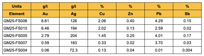 Peak assays of 6.61 g/t Au (GM25-FS006), 204 g/t Ag (GM25-FS005), and 2.06 % Cu (GM25-FS006) returned from outcrop grab samples