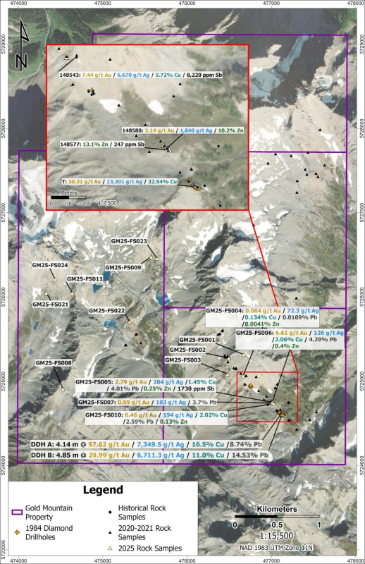 The North showing returned the highest gold grades from the 2025 exploration program, highlighted by 6.61 g/t Au and 2.06% Cu (GM25-FS006) and 6.46 g/t Au and 194 g/t Ag (GM25-FS010). Sample GM25-FS005 yielded the highest silver result at 204 g/t Ag, accompanied by 1.45% Cu and 4.01% Pb.