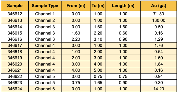 Grades up to 130 g/t Au over 1m have been returned from a recent channel sampling program carried out by the company’s exploration team. Other high-grade results include 71.3 g/t Au over 1m, and 14.2 g/t Au over 1m. The sampling program was designed to follow up on a high-grade vein that