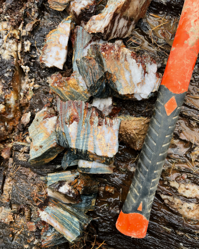 contains trace to common disseminated pyrite and lesser chalcopyrite and tourmaline. Quartz veining consists of multiple stringers to broad veins up to 120 metres long and seven metres in width. Visible gold is observed in the larger quartz veins, particularly at the southwest end of the occurrence.