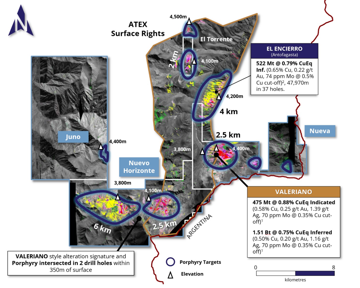 "The addition of the Nuevo Horizonte claims significantly increases our chances of a new discovery in this highly prospective district," Ben Pullinger, President and CEO, commented. "The size, scale and surface characteristics of these new targets is analogous to where we started with Valeriano and in the case of the Pachuy target, significantly bigger than the Valeriano surface footprint. Previous exploration campaigns conducted by a major mining company included geophysical surveys used for initial target generation with follow-up drilling intersecting high-grade mineralization and confirming the presence of a porphyry system within 300 meters of surface. These new targets will be the focus of our regional exploration program operated from our existing camp and infrastructure at Valeriano. ATEX will look to advance these targets to drill status over the coming months and years. ATEX has established Valeriano as the largest high-grade porphyry project in Chile in over a decade and initial exploration of these new targets has identified similar features including the potential for breccia bodies that will be explored as part of initial exploration."