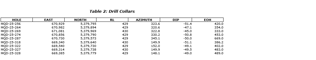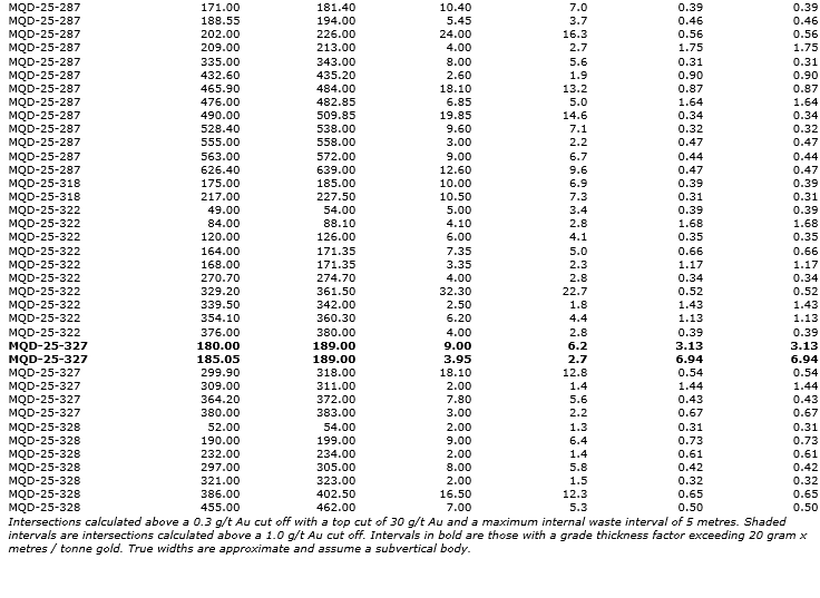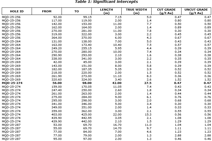 - 42.0 m of 0.47 g/t Au from 56.0 m in MQD-25-274;