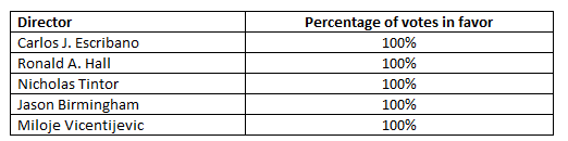At the meeting, all nominees were elected as directors of the company. A total of 5,164,700 common shares were voted at the meeting, representing 34.32 per cent of the issued and outstanding shares. Shareholders voted in favour of the election of all director nominees as shown in the following table.