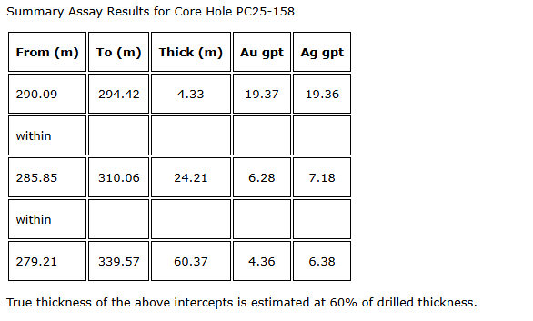 Core hole PC25-158 was collared at a 024-degree azimuth and minus-70-degree inclination. It intersected stockwork quartz-plus-calcite mineralization in andesite and conglomerate above the footwall granite. Mineralization starts at 279.21 m in andesite and continues into conglomerate at 322.37 m before encountering the hangingwall (HW) vein itself at 333.54 m. The high-grade interval occurs at the top of the mineralized structure, as encountered in hole PC25-157. It is associated with higher densities of quartz-plus-bladed-calcite veins. The shift of the high-grade intercepts into the hangingwall of the structure is similar to previous drill holes higher in the plane of the mineralized structure. The structure has always shown hangingwall and footwall veins defining the mineralized zone or corridor; the grade of those veins is what appears to vary. What is very consistent is the position and predictability of the total mineralized corridor (structure). The calcite demonstrates abundant bladed textures commonly replaced by predominantly green and yellow quartz. This suggests the company is at the top of the productive (higher-grade) boiling zone. The entire mineralized interval is summarized in the table below.