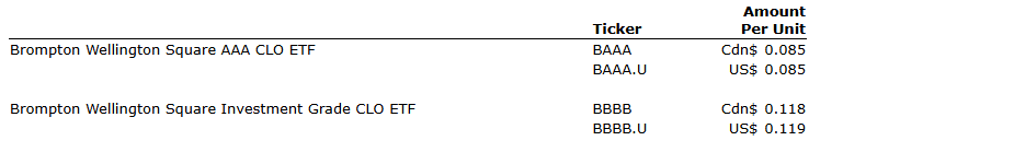 Brompton Wellington Square AAA CLO ETF and Brompton Wellington Square Investment Grade CLO ETF announce distributions payable on March 13, 2026, to unitholders of record at the close of business on Feb. 27, 2026, as shown in the attached table.