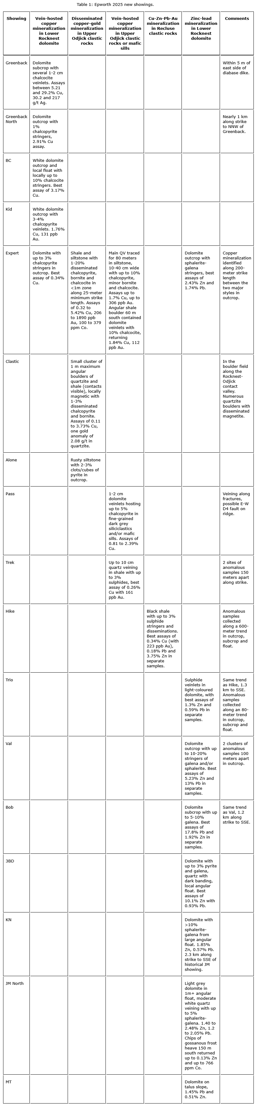 • 17 new base and precious metal showings discovered during the 2025 field program at the Epworth copper-silver project in Nunavut;