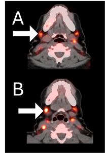 Pre-treatment imaging of cervical (neck) lymph nodes with moderate uptake indicating presence of some CD8+ cytotoxic (“killer”) T cells.