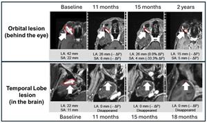 Bria-IMT treatment resulted in complete resolution of the right temporal lobe lesion and continued regression of the right orbital (behind the eye) tumor. Measurements of lesion sizes are shown.