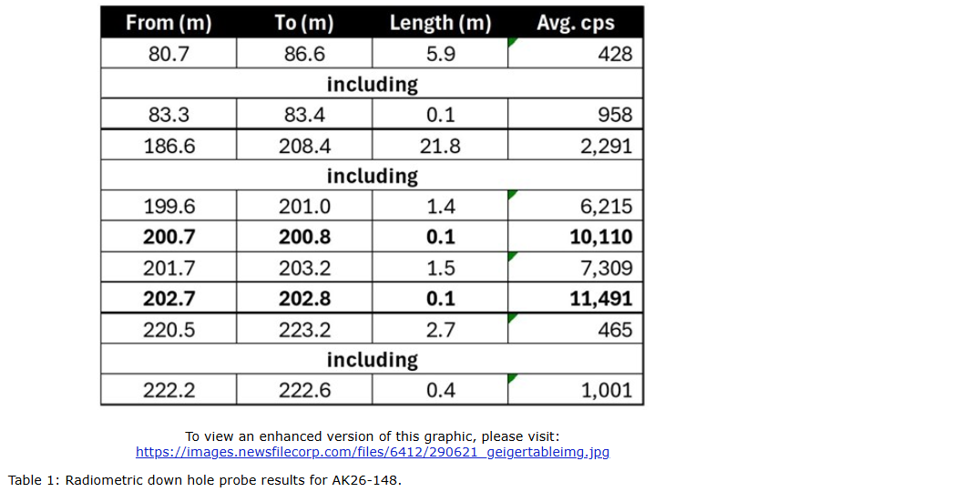 All drill core is scanned with a CT-007 handheld spectrometer by GammaGuard to check for radioactivity. Intervals of anomalous radioactivity are removed and measured outside the box in an area of background radioactivity. Drill holes are also surveyed using a 2GHF-1000 triple gamma probe with a Mount Sopris Matrix Logging Console and Mount Sopris 4MXA 500 or 1,000 metres winch at 0.1-metre intervals. Mount Sopris's 2GHF-1000 downhole triple gamma probe utilizes a sodium iodine (Nal) crystal to detect changes in natural radioactivity for concentrations of uranium, thorium and potassium from gamma rays emitted from the rock formations. The probe uses a Nal crystal, and two Geiger Mueller tubes which allows the instrument to conduct precise natural gamma measurements that range from 0.1 per cent to 20 per cent concentrations of U3O8 (triuranium octoxide) in radioactive zones. Downhole probe results are used to compare with handheld scintillometer results to verify the depth and strength of radioactive intervals and to assess radioactivity through sections of lost core. The downhole radiometric probe results using the NaI values are presented in this news release. Measurements of total gamma on drill core or from the down hole probe are an indication of uranium content but may not correlate with chemical assays. Assay samples will be submitted for chemical analysis and will be presented in the coming months.