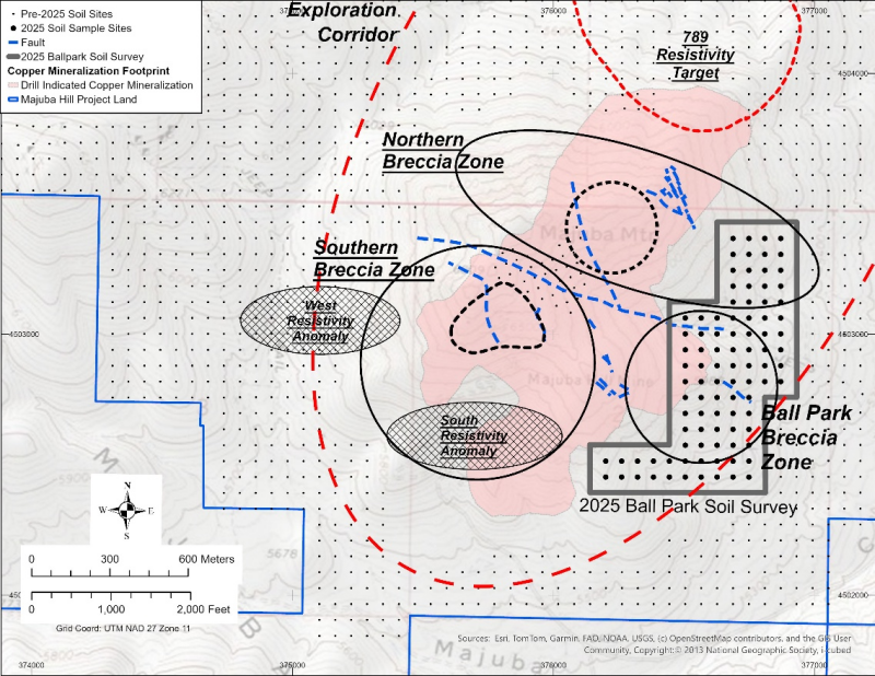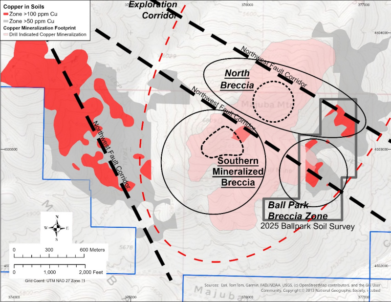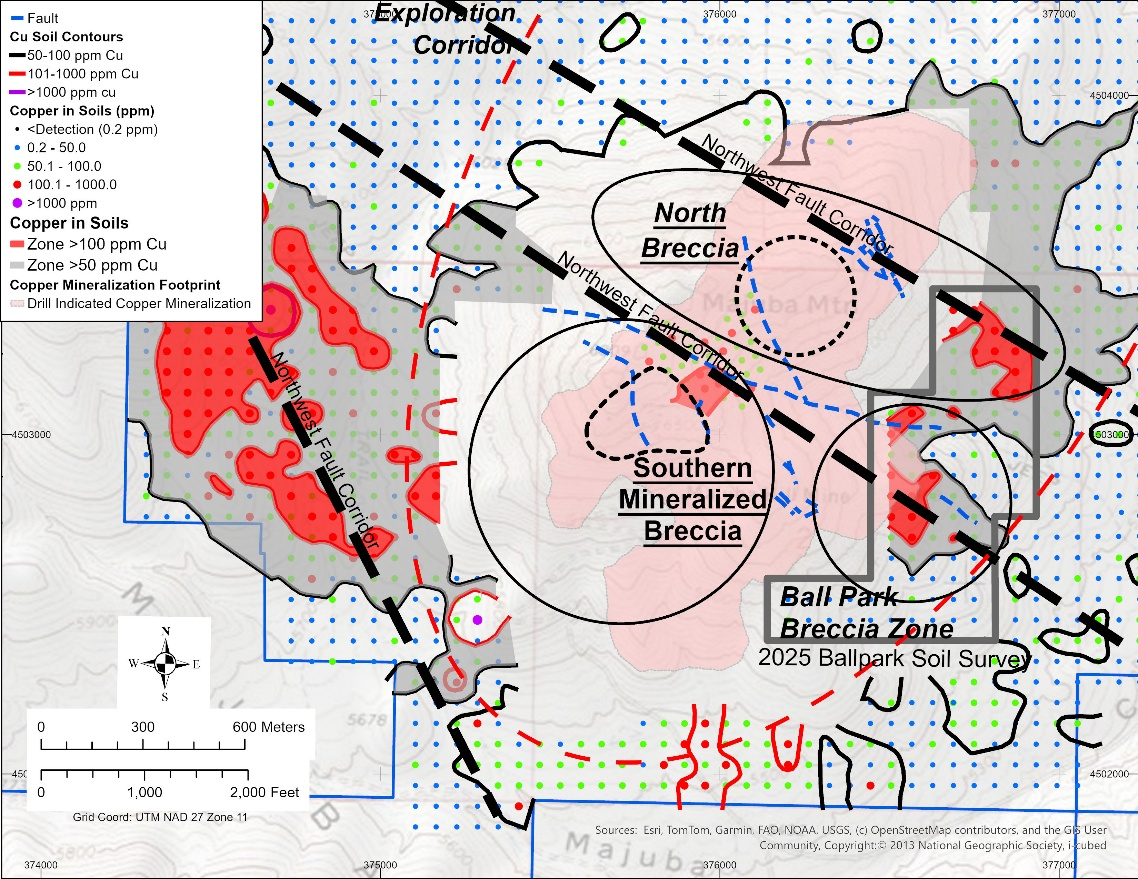 Figure 2: Majuba Hill 2025 Ball Park Breccia Soil Survey-Copper showing controls to mineralization and mineralized breccias.