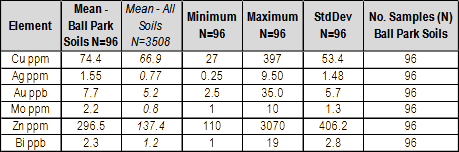 Twenty-one samples out of the 96 Ball Park Soils returned >100 ppm Copper with a maximum value of 397 ppm Cu. 24 out of the 96 returned greater than 2 ppm Silver with a maximum of 9.5 ppm Ag (see Table 1 and Figure 1).