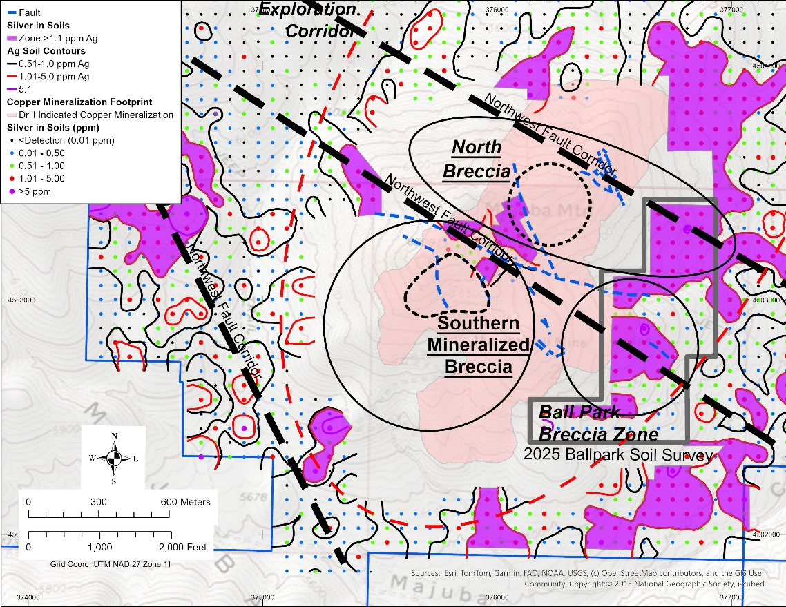 Figure 4: Majuba Hill 2025 Ball Park Breccia Soil Survey-Silver showing details defining anomalous copper and Fault Corridors