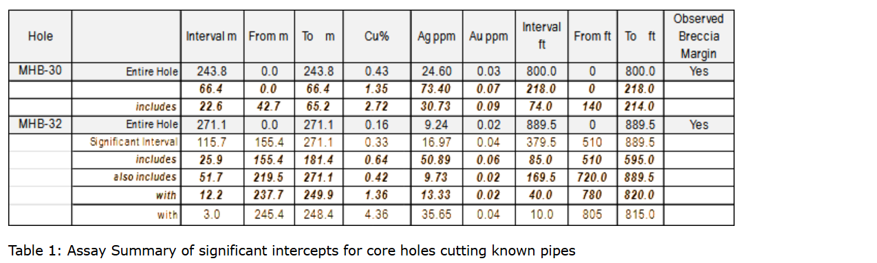 Sept. 24, 2024). The intercepts in core holes MHB-30 and MHB-32 returned high-grade copper and silver as well as highly anomalous gold. The high-grade intercepts noted on Table 1 correlate with the margins of the breccia pipes.