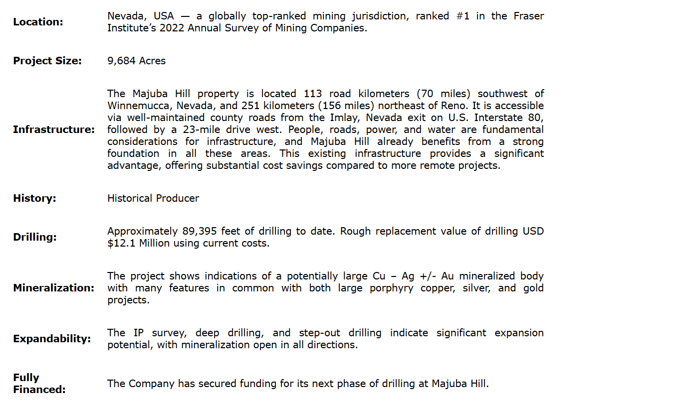 The company's flagship asset is the Majuba Hill copper, silver and gold district, located 156 miles (251 kilometres) from Reno, Nev. Majuba Hill benefits from a mining-friendly regulatory environment and strong local infrastructure. While still an exploration-stage