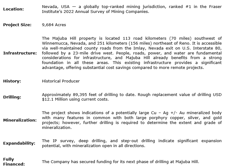 The company's flagship asset is the Majuba Hill copper, silver and gold district, located 156 miles (251 kilometres) from Reno, Nev. Majuba Hill benefits from a mining-friendly regulatory environment and strong local infrastructure. While still an exploration-stage asset, the geological footprint and scale of mineralization indicate that further work is clearly justified and that the system may host significant copper potential.