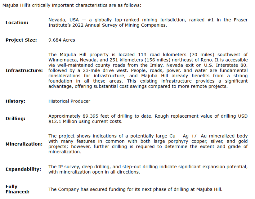 The company's flagship asset is the Majuba Hill copper, silver and gold district, located 156 miles (251 kilometres) from Reno, Nev. Majuba Hill benefits from a mining-friendly regulatory environment and strong local infrastructure. While still an exploration-stage asset, the geological footprint and scale of mineralization indicate that further work is clearly justified and that the system may host significant copper potential.
