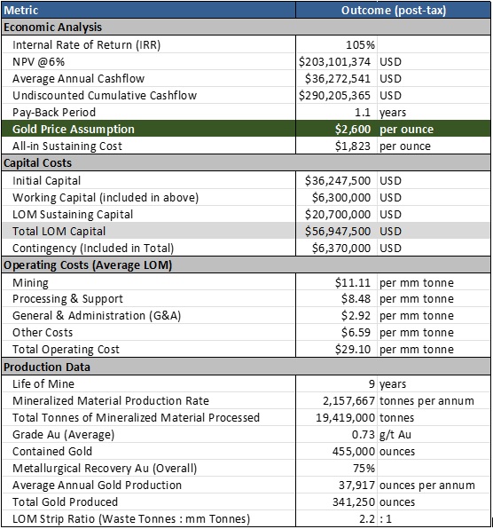 Updated PEA Base-Case Results (Post-Tax) at US$2,600 Gold: