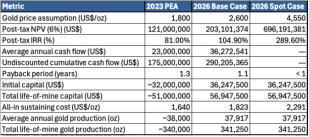 Table 2. Comparison of key post-tax economic metrics between the 2023 PEA and the updated 2026 PEA, along with a "spot case" from the 2026 sensitivity study, comparable to recent gold prices.