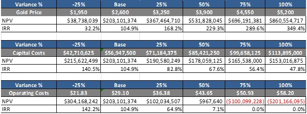 Table 3. Post-tax sensitivity of NPV(6%) and IRR to changes in gold price, capital cost and operating cost assumptions.