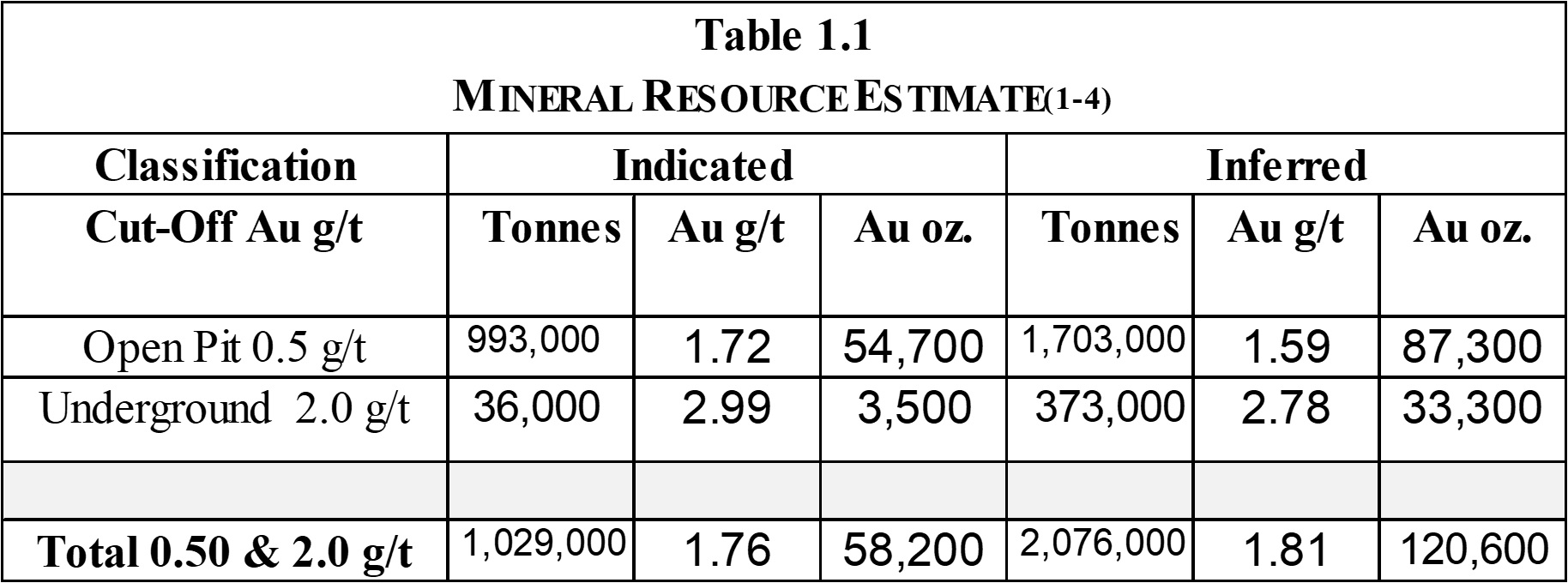 - A 0.5-gram-per-tonne-gold-cut-off open-pit mine design with a 1.72-gram-per-tonne-gold average within a 993,000-tonne indicated resource and a 1.59-gram-per-tonne-gold average within a 1,703,000-tonne inferred resource;