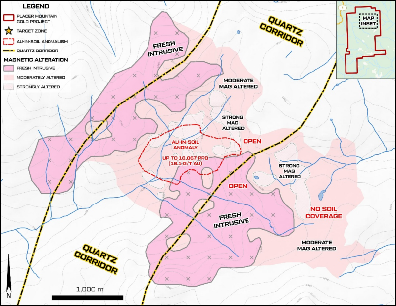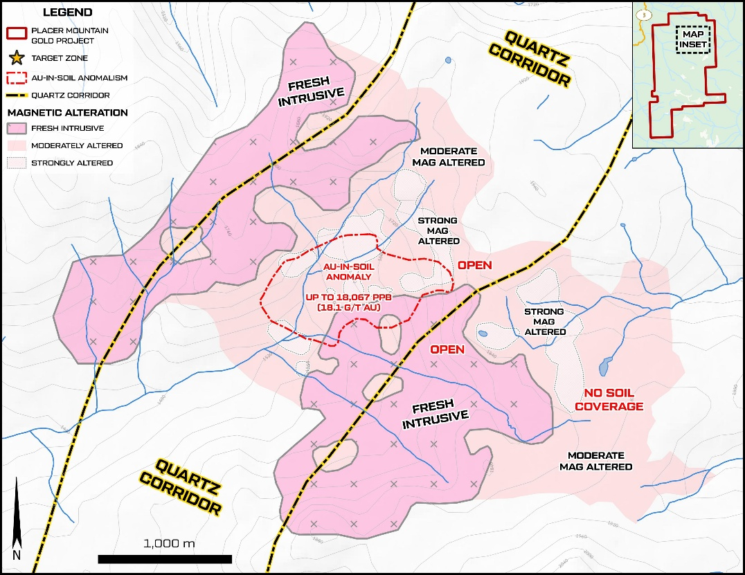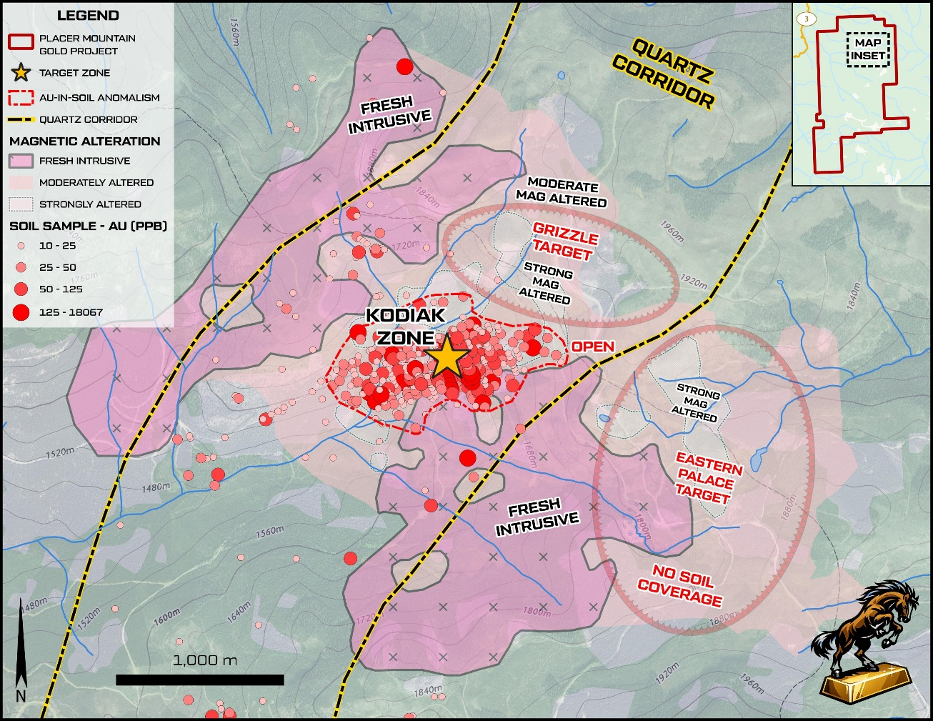 A newly identified area of note , the Eastern Palace Target, has been selected for soil coverage in 2026 . The soil anomaly over the Kodiak Zone remains open to the east and south, with samples up to 345 ppb Au in soil near the margin of the prior grid area, coincident with magnetic alteration.