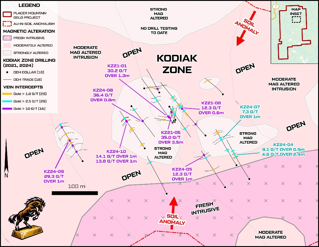 Figure 5 - Magnetic alteration domains and drill intercepts at Kodiak Zone.