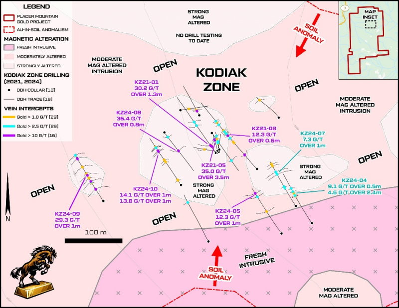 Low magnetic trends in the data show correlation to prior drilled mineralized quartz intercepts. The zones of magnetite degradation in the diorite represent a larger spatial footprint than previously recognized. This greatly increases the potential target area at Kodiak Zone . Magnetic alteration extends west, east, and north of known mineralization. An additional completely untested region, the Grizzle Target (Figure 6, below), remains for follow up in 2026.