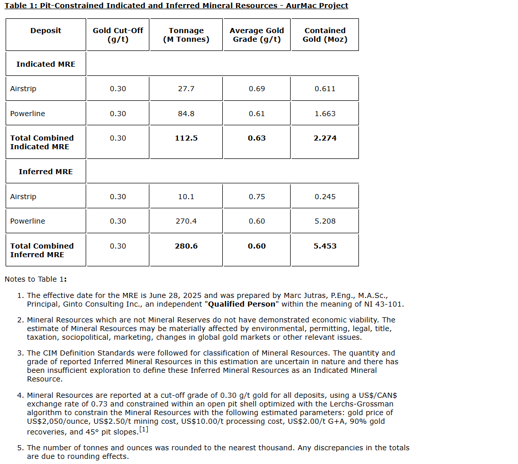 In addition to the AurMac project, the company holds the Hyland gold project, located 70 km northeast of Watson Lake, Yukon, along the southeast end of the Tintina gold belt in the Traditional Territory of the Kaska Nations, closest to the Liard First Nation and Daylu Dena Council. The Hyland project represents a sediment hosted, structurally controlled, intrusion-related gold deposit, within a large land package (over 125 square km), accessible by a network of existing gravel access roads. The updated MRE comprises an indicated mineral resource of 337,000 (K) ?ounces (oz) of gold (Au) and 2.63 million (M) oz of silver (Ag) (11.3 M tonnes of ore at 0.93 g/t Au and 7.27 g/t Ag), and an inferred mineral resource of 118,000 oz of Au and 860,000 oz Ag (3.9 M tonnes of ore at 0.95 g/t Au and 6.94 g/t Ag) (as defined in the Canadian Institute of Mining, Metallurgy and Petroleum (CIM) Definition ?Standards for Mineral Resources & Mineral Reserves incorporated by reference into NI 43-101) effective Sept. 1, 2025, and with technical report filed on SEDAR+ on Oct. 27, 2025.