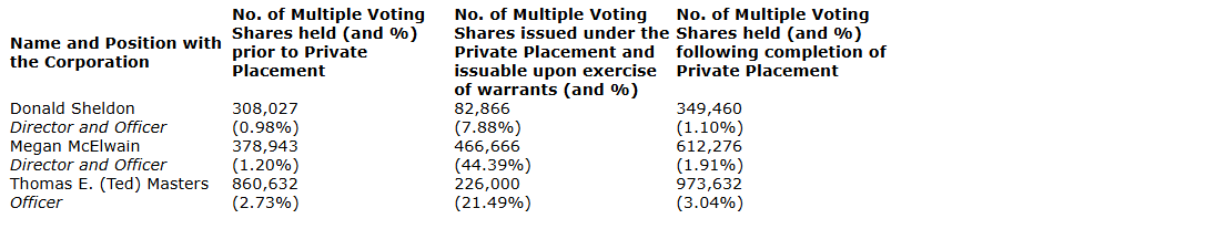The following insiders of the company (each, an insider) participated in the private placement for an aggregate of 387,766 units representing the equivalent of 2.42 per cent of the company's issued and outstanding multiple voting shares (calculated on the basis of conversion of the subordinate voting shares into multiple voting shares on a ratio of 100:1) on a partly diluted basis following closing of the private placement.