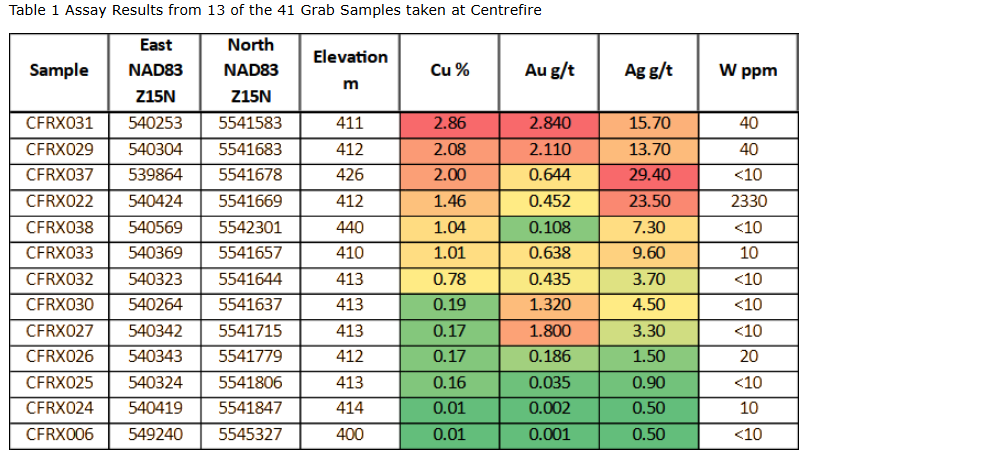 has received assay results from the first batch of samples from a field program of ground truthing geophysical anomalies and rock sampling at its Centrefire copper and gold project located approximately 40 kilometres northeast of Dryden, Ont., Canada.
