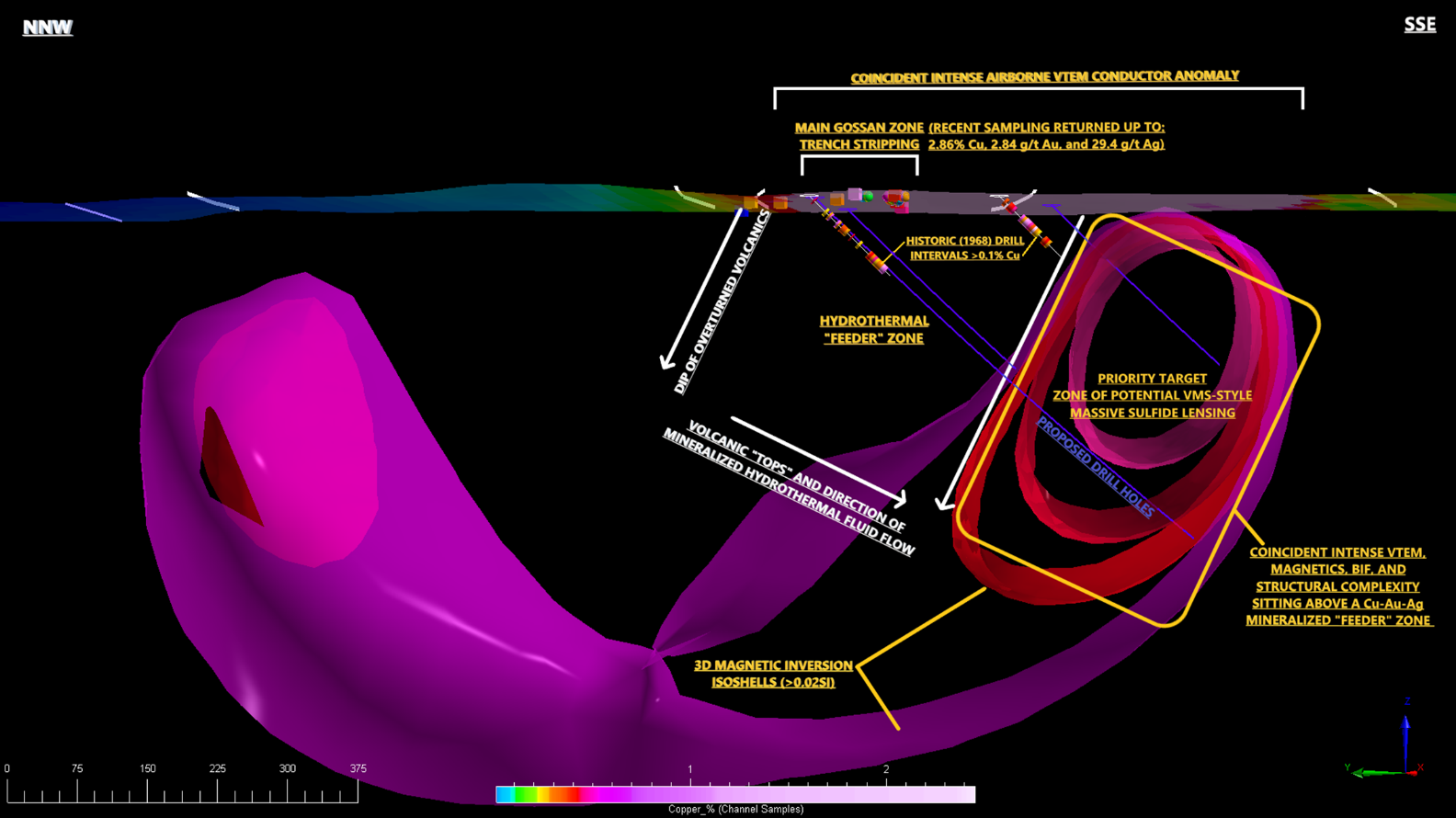 Drilling will focus on the High-Grade Main Gossan Zone (MGZ) located in the southwestern portion of the Project area. Trenching and grab sampling have returned values up to 2.85% Cu, 2.84 g/t Au, and 29.4 g/t Ag from rusty volcanics and pillowed flows. It is interpreted that the VMS system has been overturned and the feeder zones will have a relatively small footprint close to surface with larger and laterally extensive lenses at depth. The planned drill program will intersect the interpreted MGZ Feeder near surface and test for massive sulphide lenses with a number of deeper holes.