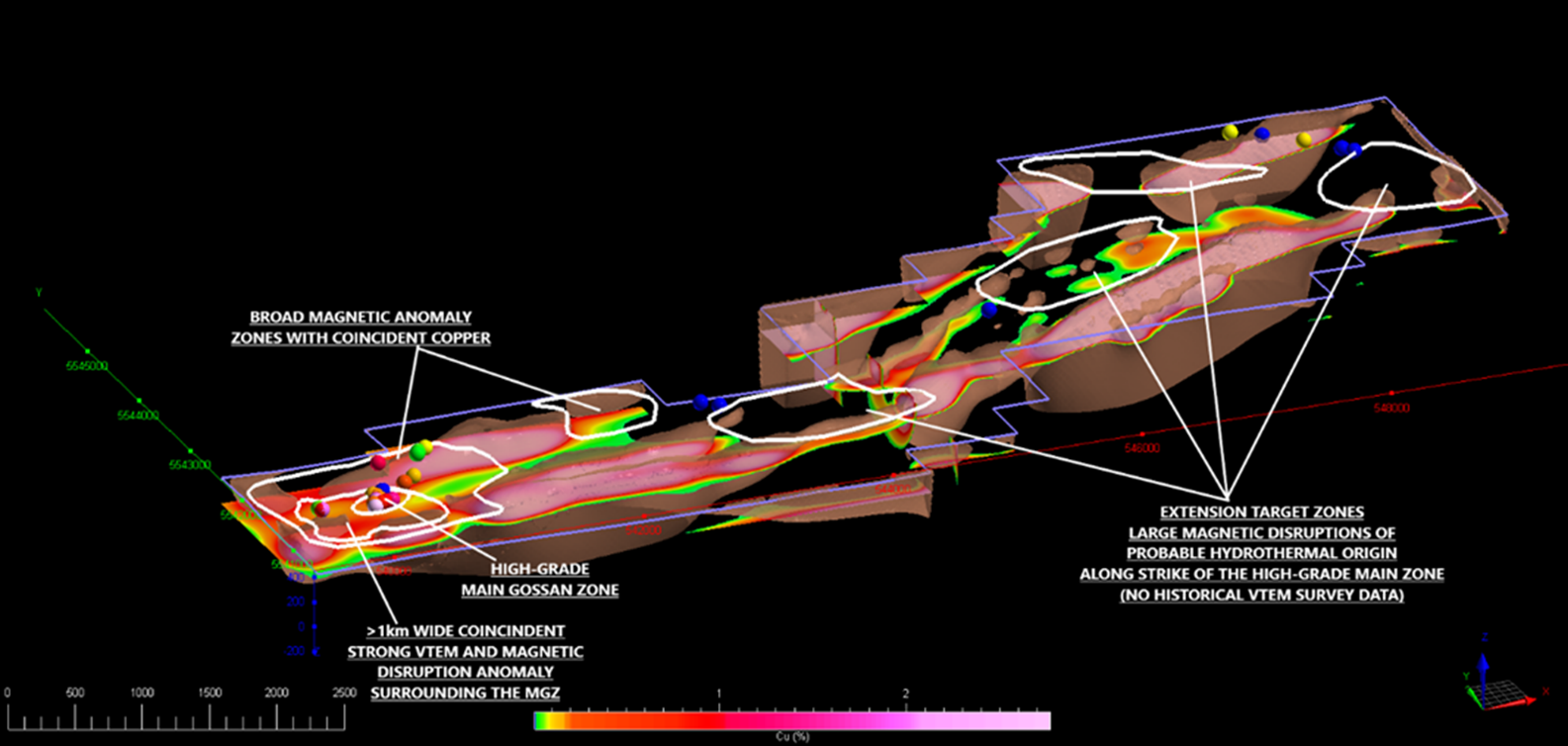 Cascade has developed its geological model for this Volcanogenic Massive Sulphide (VMS) style of deposit through a compilation of historic data, from new surface sampling collected by trenching and rock sampling that verifies the historic work and by flying high resolution drone based magnetics . Subsequent modelling in 3D and inverting the magnetic data has produced several target zones for copper, gold, and silver mineralization.