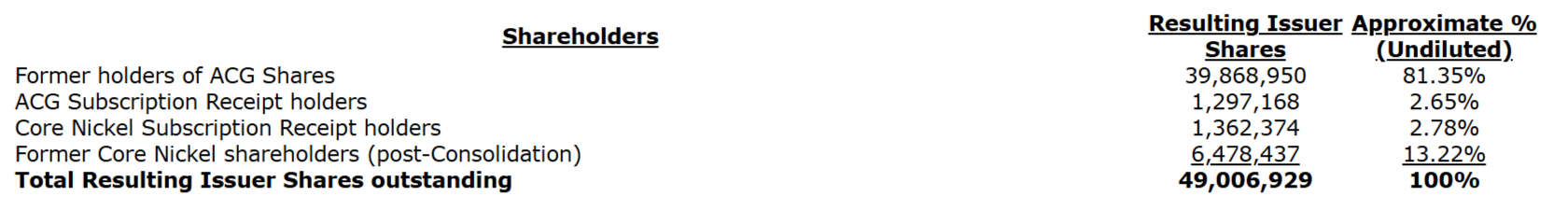 On March 24, 2026, the subscription receipts of both ACG and Core Nickel issued in connection with the concurrent brokered private placements that closed on Nov. 26, 2025, converted in accordance with their terms upon satisfaction of the escrow release conditions, and the net proceeds thereof have been released to the resulting issuer. The concurrent financings were led by Stifel Canada and Clarus Securities Inc., as co-lead agents and joint bookrunners, on behalf of a syndicate of agents which included PowerOne Capital Markets Ltd. Further information regarding the concurrent financings can be found in the news release of the parties dated Nov. 26, 2025.