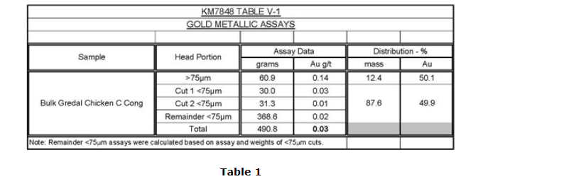 A 500-gram pulverized head cut was used for a 75-micrometre screen metallics gold content determination. Two grind calibrations were conducted to achieve a primary grind sizing target of about 100 mum P80. The less than 75 mum fraction was assayed to extinction and two 30 g cuts from the 75 mum fraction were considered to adequately represent the remainder portion of the sample (Table 1).