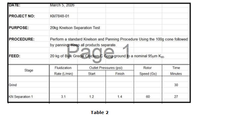 A one-pass 20-kilogram Knelson gravity test was conducted, with a 100 g cone used to collect the Knelson concentrate. The Knelson separation test conditions are further defined in Table 2. The Knelson concentrate was hand panned to produce a pan concentrate and a pan tail. The pan concentrate was assayed to extinction for gold, and the pan tails and Knelson tails were assayed for gold in duplicate (Table 3).