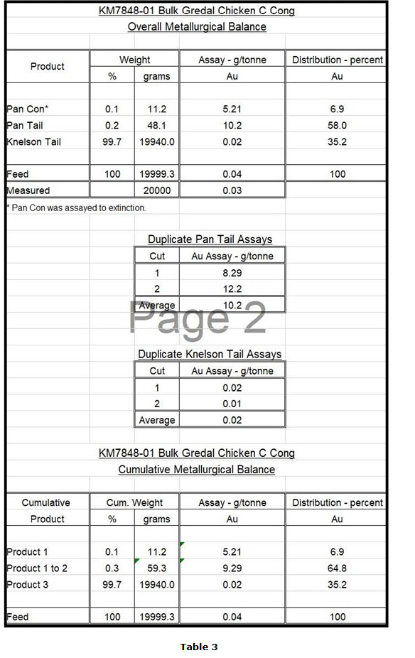 The Knelson separation test produced a Pan concentrate weighing 11.2 g, representing 0.1 per cent of the 20 kg sample and assayed 5.21 g/t Au, containing 6.9 per cent of the Au in the sample. The Pan tails were 48.1 g representing 0.2 per cent of the sample and assayed 10.2 g/t Au, containing 58.0 per cent of the Au in the sample. The Knelson tails were 19.9993 kg representing 99.7 per cent of the sample and assayed 0.02 g/t Au representing 35.2 per cent of the Au in the sample. The weighted average gold concentration of the 20 kg bulk sample was thus 0.03 g/t Au (Table 3).