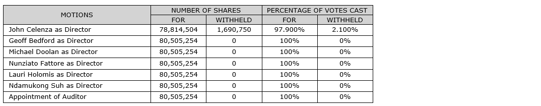 Shareholders voted in favour of all items of business put forth at the meeting, including the appointment of MNP LLP as its outside auditor and the election of all director nominees. A total of 37.973 per cent of the issued and outstanding common shares of the corporation were represented either in person or by proxy.