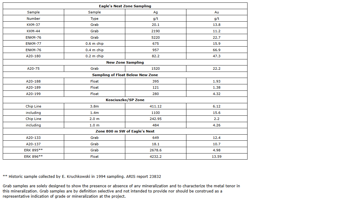 - 4.5 g/t gold and 754 g/t silver over 1.8 m in DDH-DN20-01 on the Kosciuszko zone;