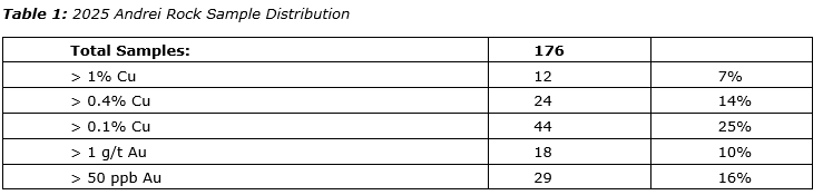 A total of 351 rock samples were collected across the Newmont Lake project during the 2025 field season. A total of 176 samples were collected from the Andrei target area, which is a large, low-elevation and easily accessible porphyry copper-gold target located in the northern portion of the property. Additional sampling included targets within the McClymont gold structure and within the Camp zone structurally controlled vein system. Reconnaissance samples were collected in a number of other sites on the property.