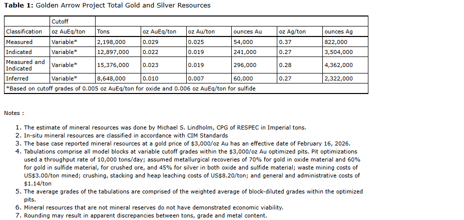 - Bulk sampling with primary objective to better understand why the calculated head grades for samples subjected to historical column testing ranged from 0.039 to 0.077 ounce Au/ton (Jack S. McPartland, 2008), which were significantly higher than the Golden Arrow resources discussed in this report. Further metallurgical testing will also be required to determine the effects of gold grade and sulphide content on heap leach recoveries;
